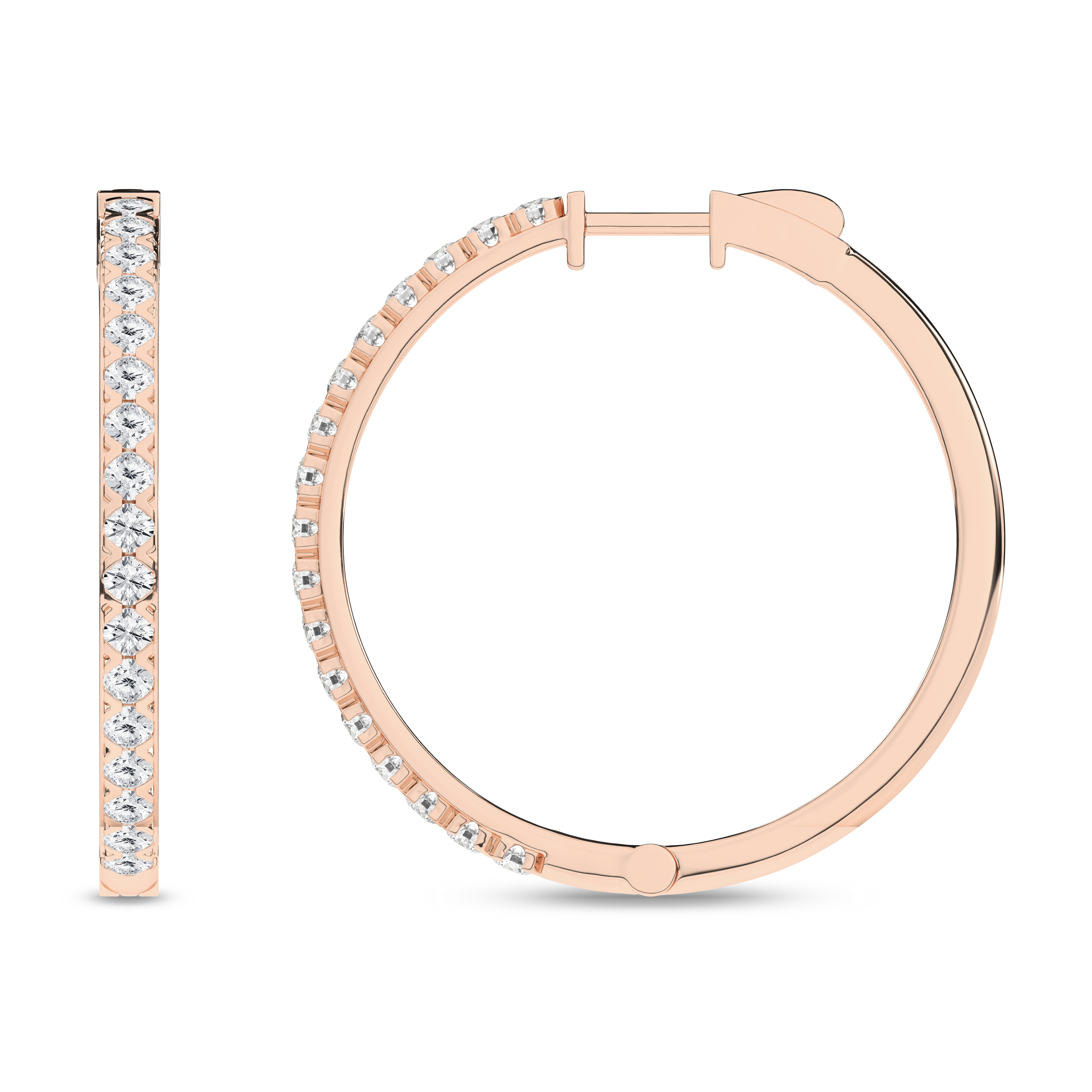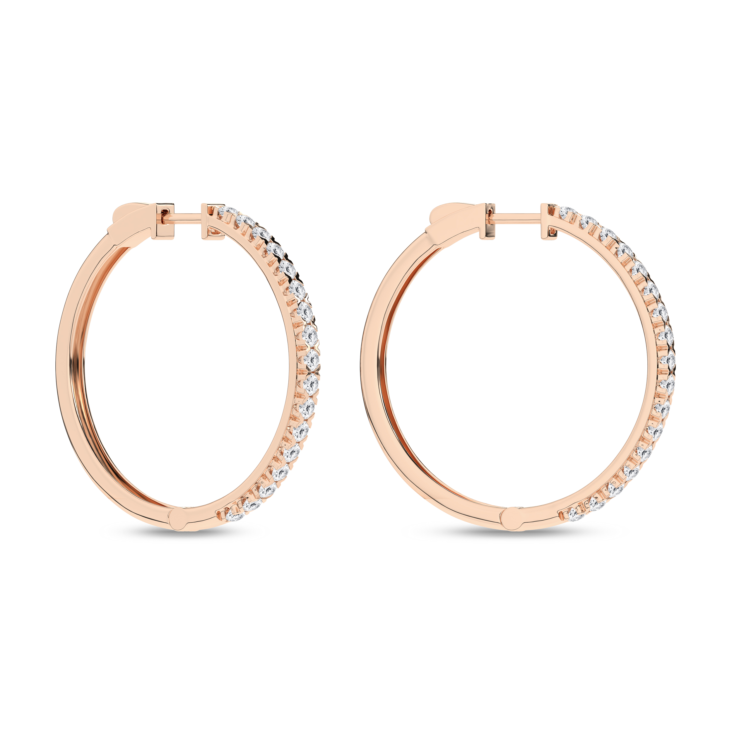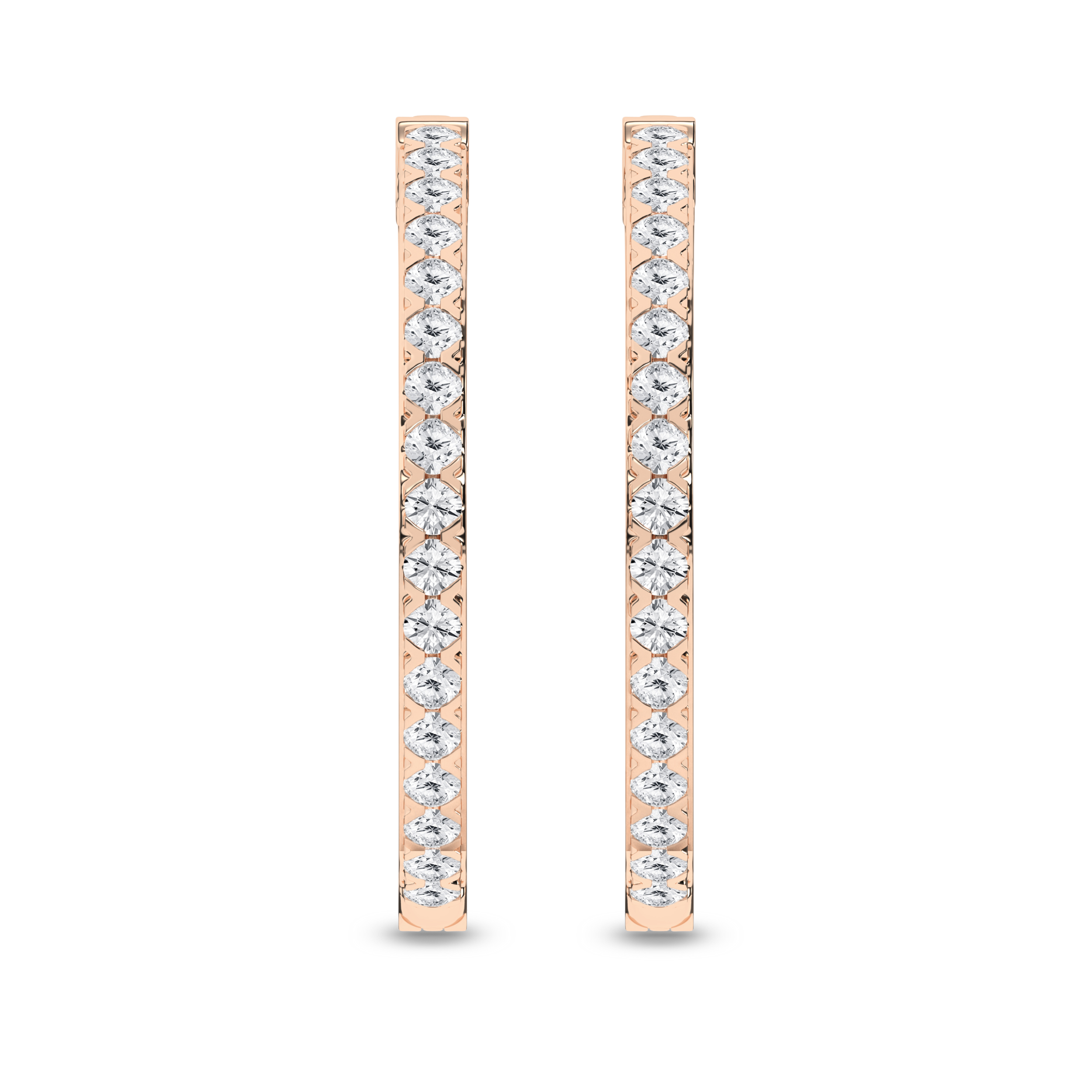 Timeless Lab Grown diamond hoop earrings set in 14KT rose gold, with EF color and VS clarity diamonds certified by IGI. This hoops pair features 2 ctw of prong-set brilliant-cut Revelation round diamonds. Designed with a hinged post for comfort and security, these earrings are a stunning addition to your jewelry collection.