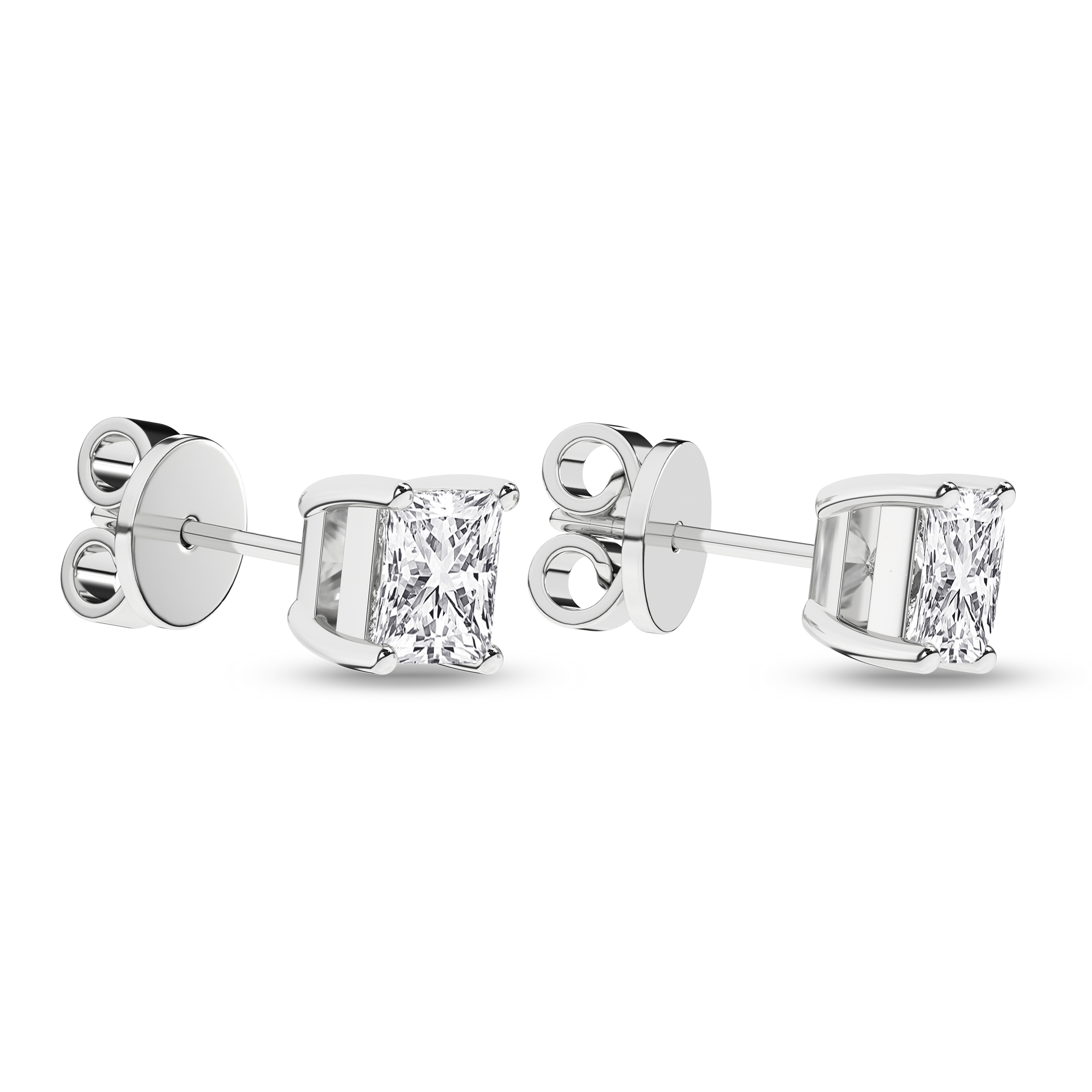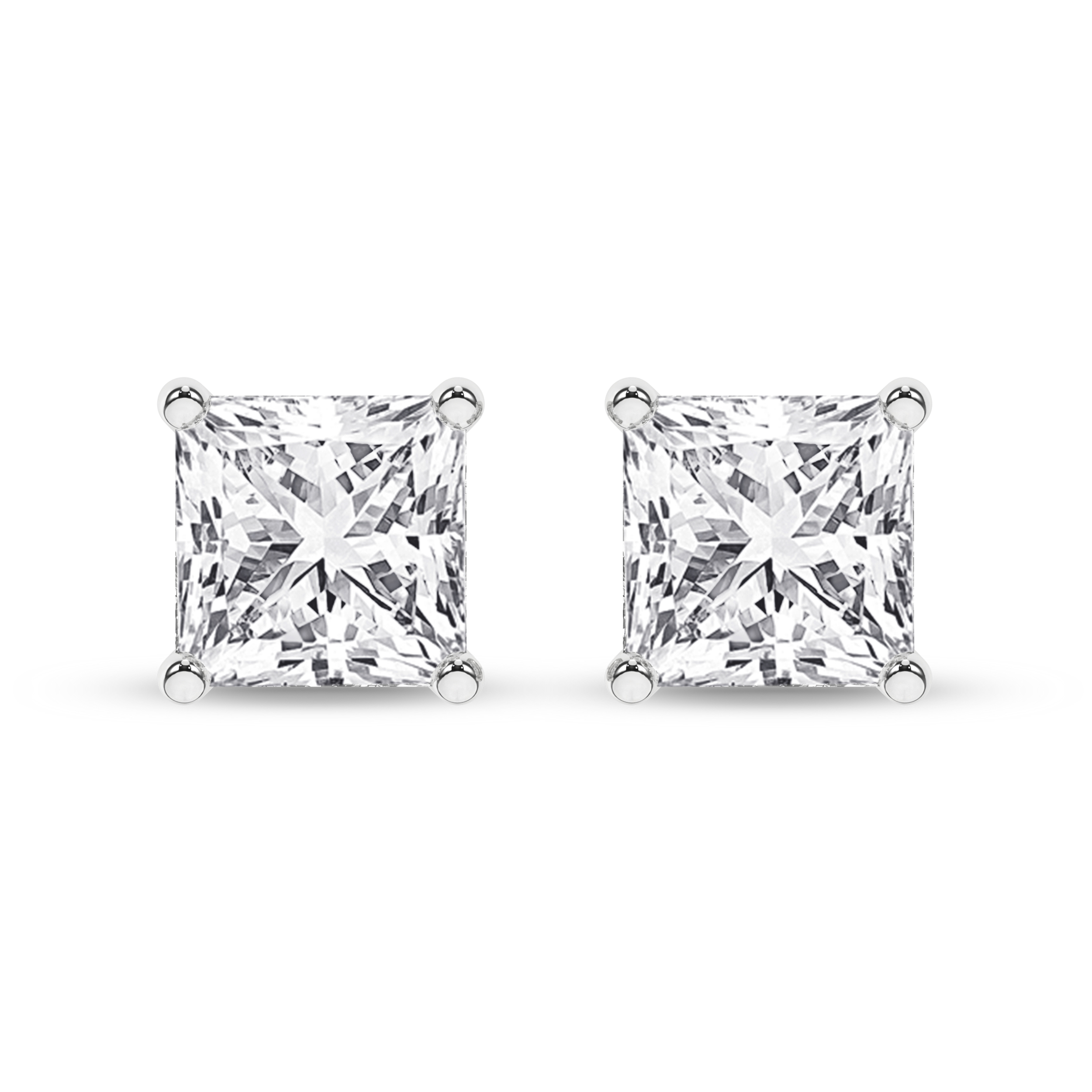 Timeless princess Lab Grown diamond solitaire stud earrings, IGI-certified for their exceptional quality, are set in 14KT white gold and radiate with 2 ctw of diamonds. Each earring showcases a brilliant Revelation 1 ct. princess diamond solitaire, known for its captivating sparkle and fire, presented in a classic four-prong setting. These post earrings are secured confidently and comfortably with pushbacks. The diamonds' impressive EF color and VS clarity, affirmed by the IGI certification, ensure a remarkable and enduring adornment that effortlessly combines sophistication with beauty.