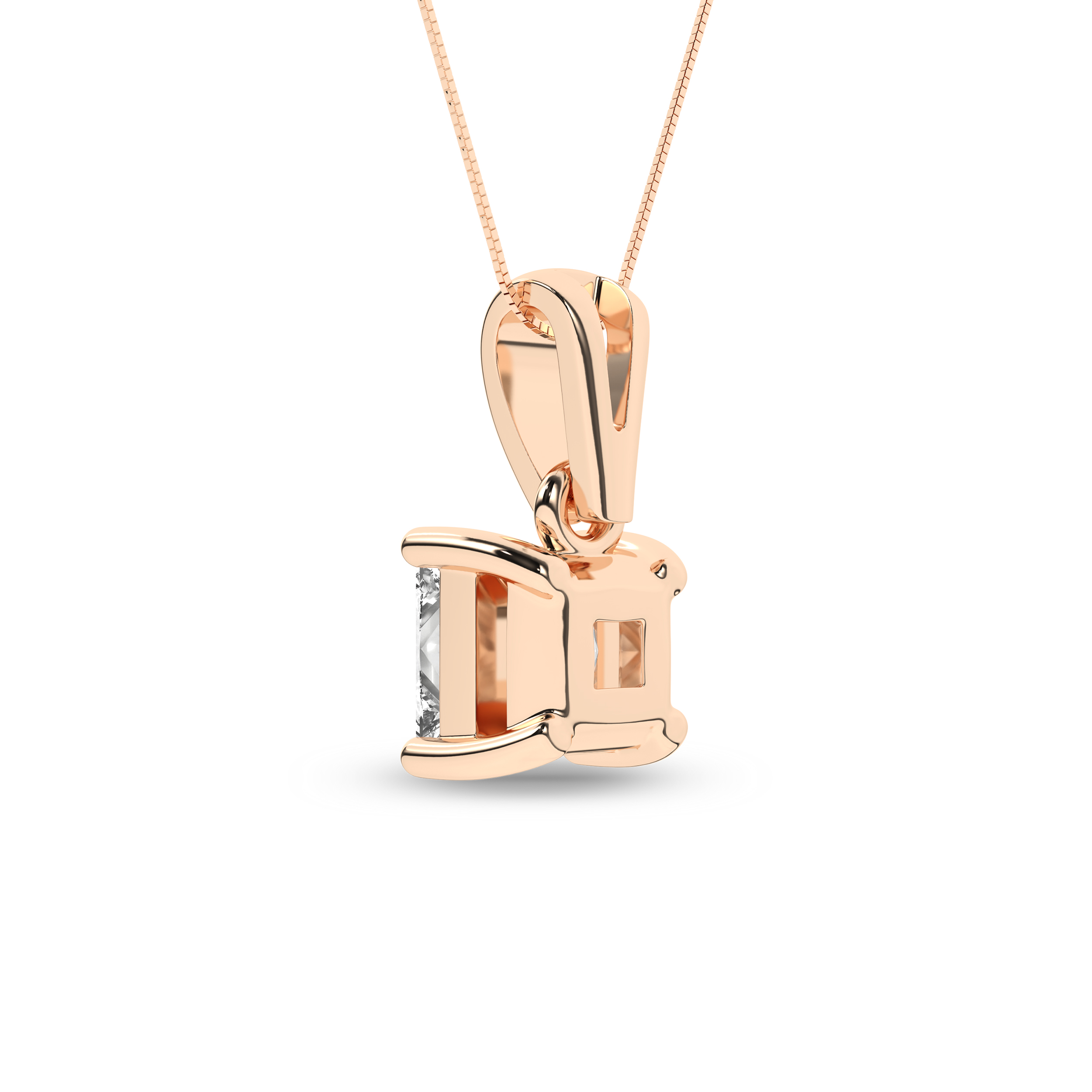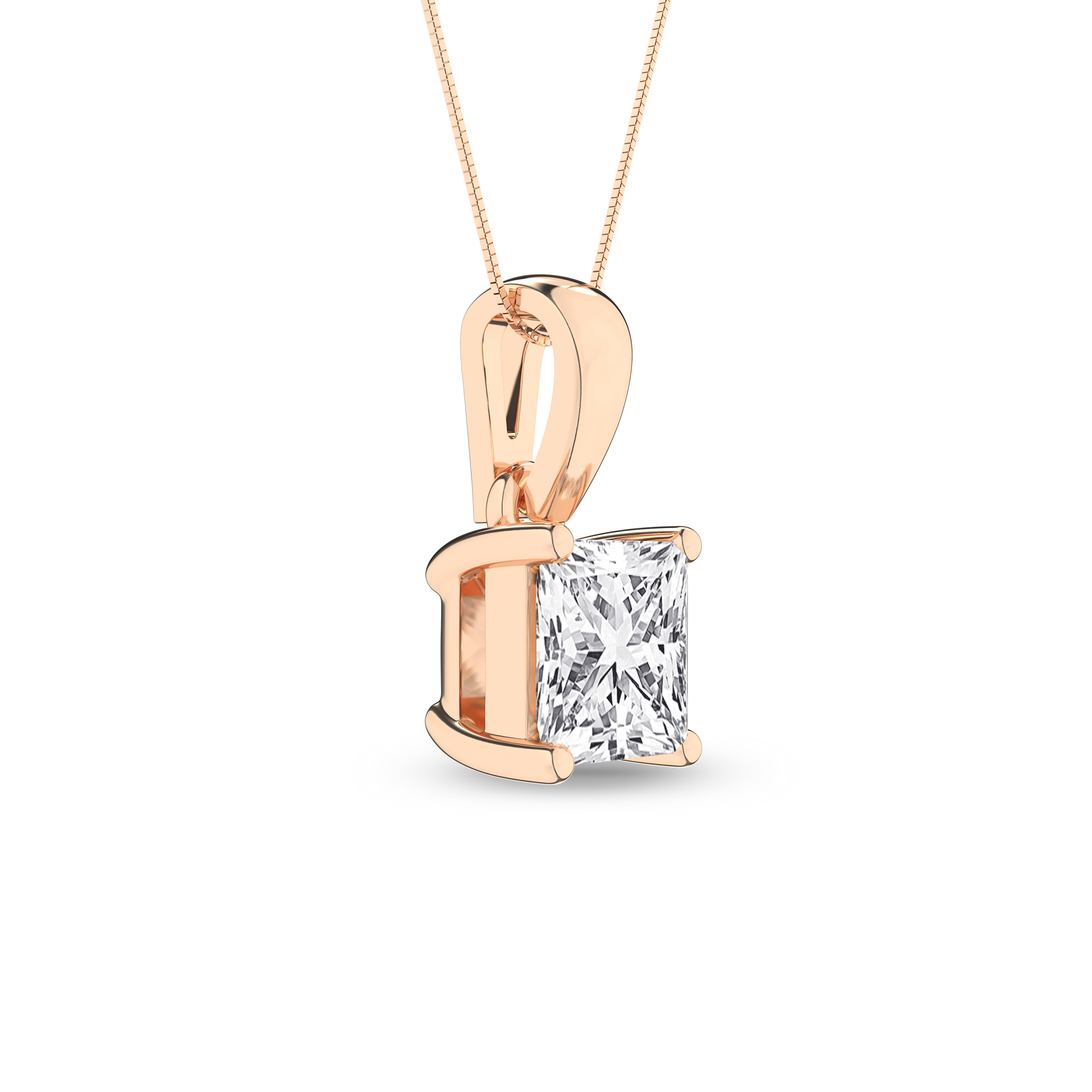 Introducing our classic princess Lab Grown diamond solitaire pendant - a true emblem of elegance. This pendant, meticulously IGI-certified to authenticate its quality, is set in 14KT rose gold and adorned with 1 1/2 ct princess cut diamond solitaire, which shimmer brilliantly within a vibrant four-prong setting. The pendant includes a box chain that is securely fastened with a spring ring lock. Notably, the diamonds possess a remarkable F color and VS clarity, attributes verified by the IGI certification process.
