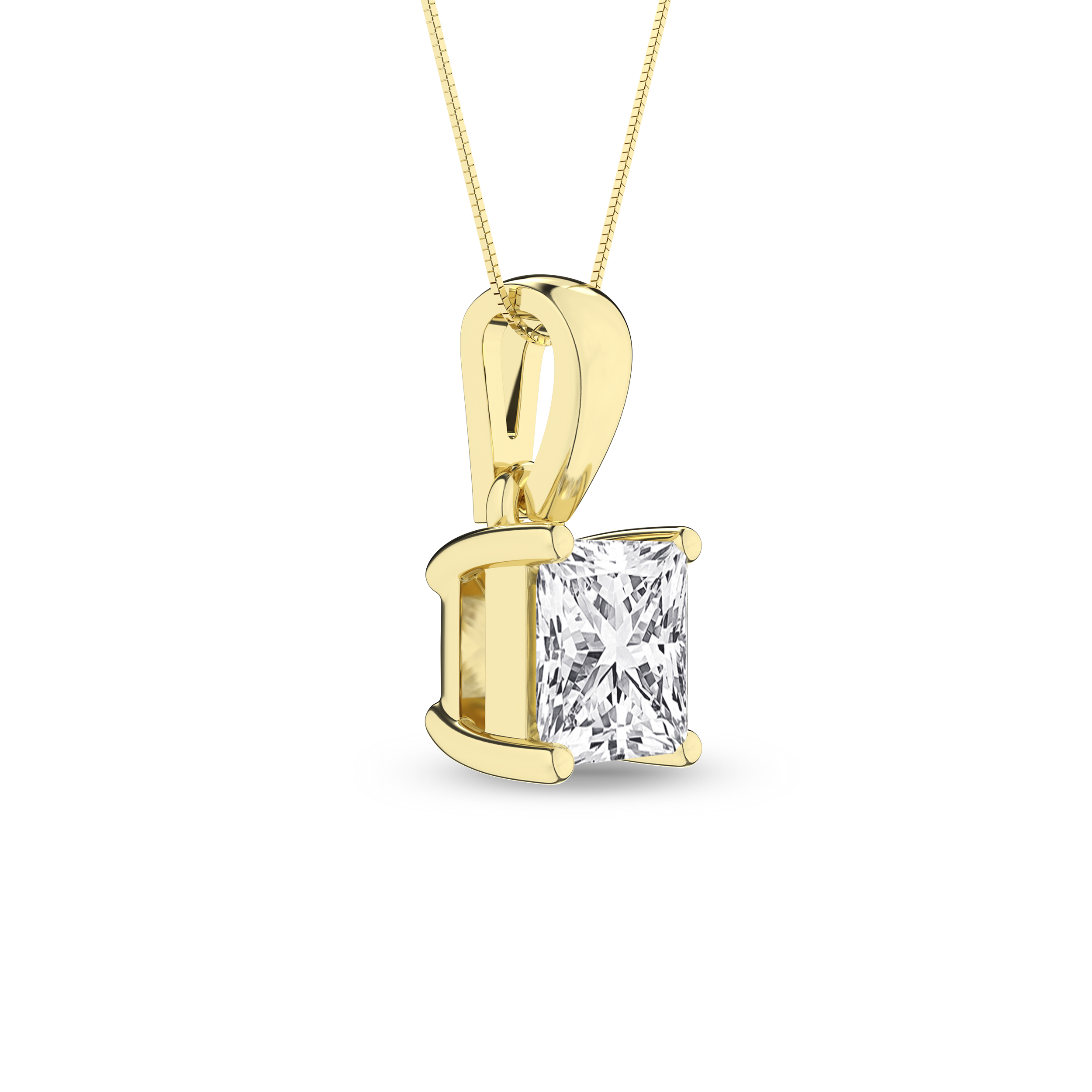 Introducing our classic princess Lab Grown diamond solitaire pendant - a true emblem of elegance. This pendant, meticulously IGI-certified to authenticate its quality, is set in 14KT yellow gold and adorned with 1 1/2 ct princess cut diamond solitaire, which shimmer brilliantly within a vibrant four-prong setting. The pendant includes a box chain that is securely fastened with a spring ring lock. Notably, the diamonds possess a remarkable F color and VS clarity, attributes verified by the IGI certification process.
