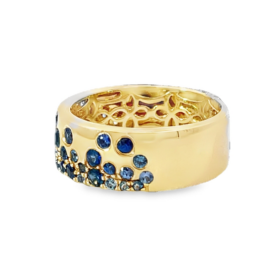 Exquisitely crafted in yellow gold, this band ring showcases a mesmerizing arrangement of round cabochon-cut sapphires. The sapphires, exhibiting a rich royal blue hue, are meticulously set, offering a harmonious balance of color and texture. A sophisticated piece that exudes elegance and charm, perfect for adding a touch of refined style to any ensemble. 14K Yellow Gold, 1.12Tw Round Sapphires, Size 7