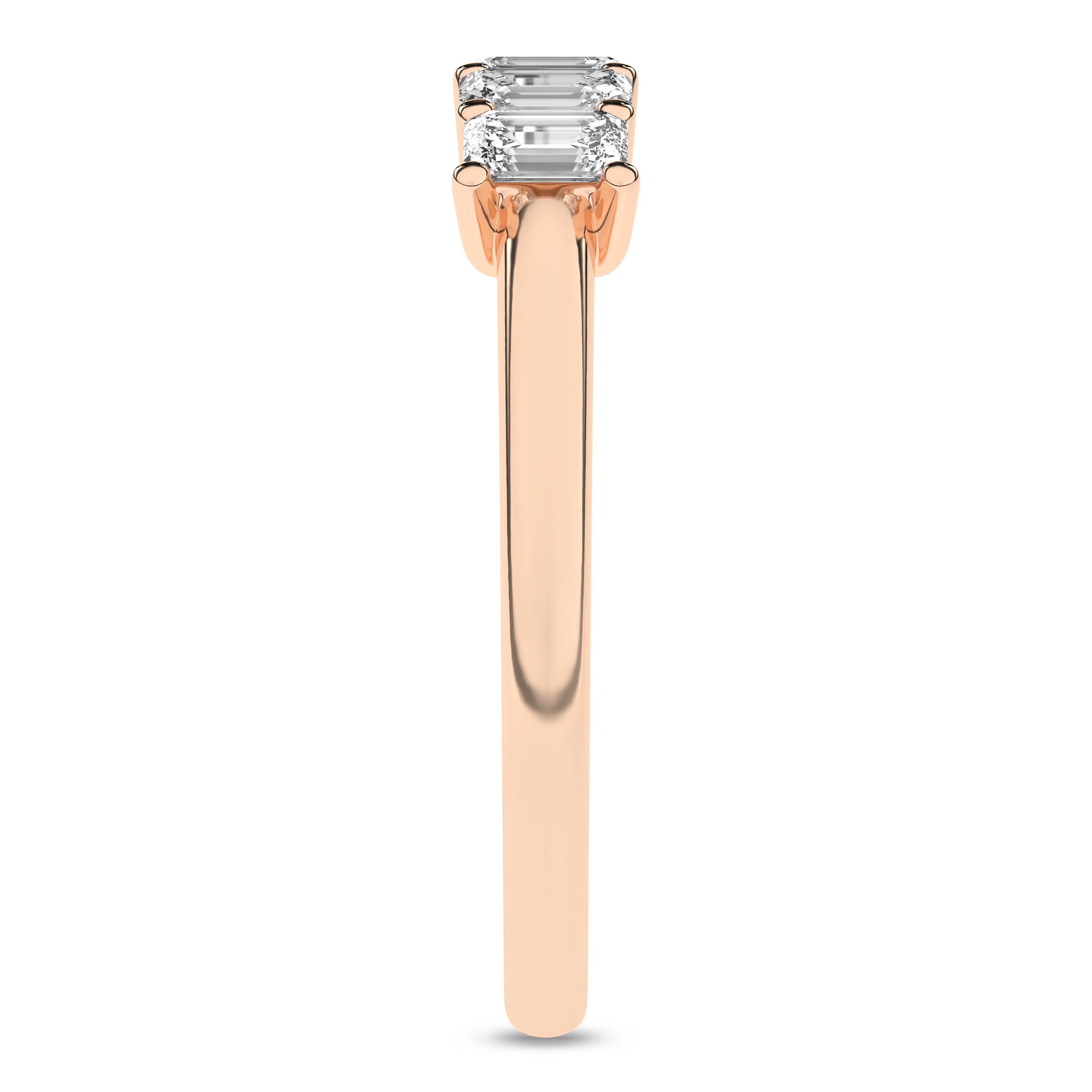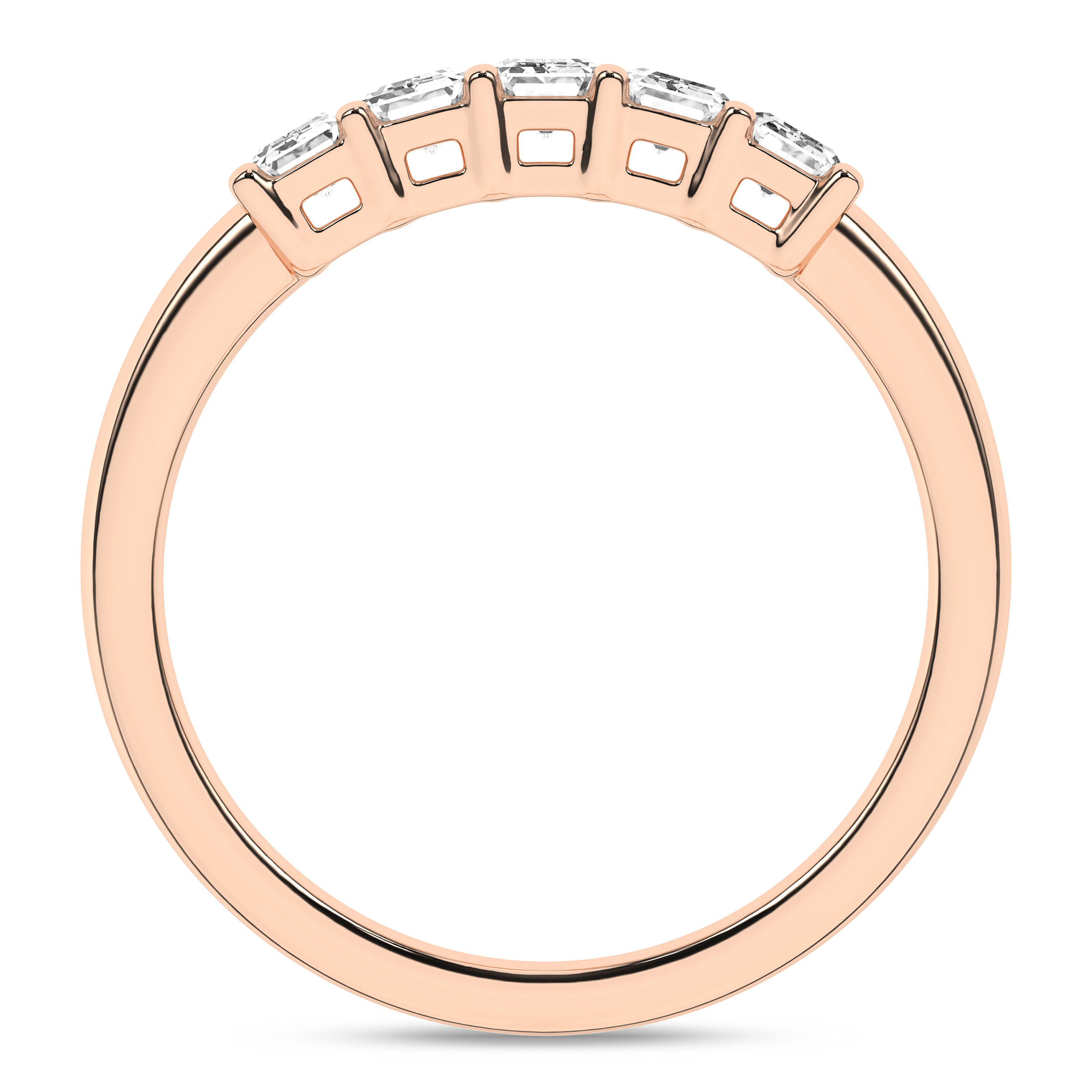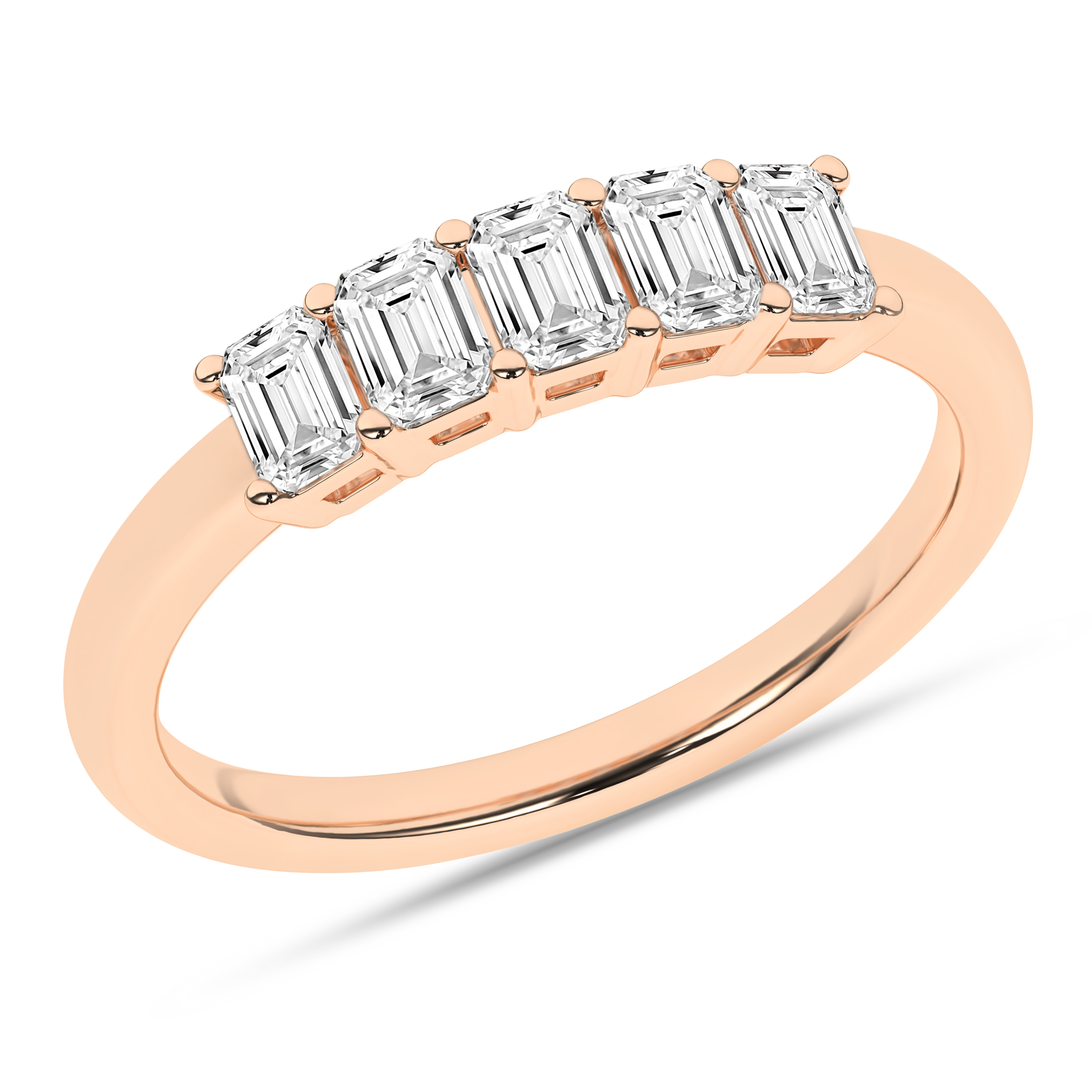 The emerald cut Lab Grown diamond 5-stone band, certified by IGI for quality assurance, is set in 14KT rose gold and studded with 1 ctw of diamonds in a timeless four-prong setting. Each emerald-cut Revelation diamond, weighing 1/5 ct., exhibits EF color and VS clarity. This combination of exquisite diamonds and meticulous craftsmanship creates a truly remarkable piece that radiates elegance and sophistication.