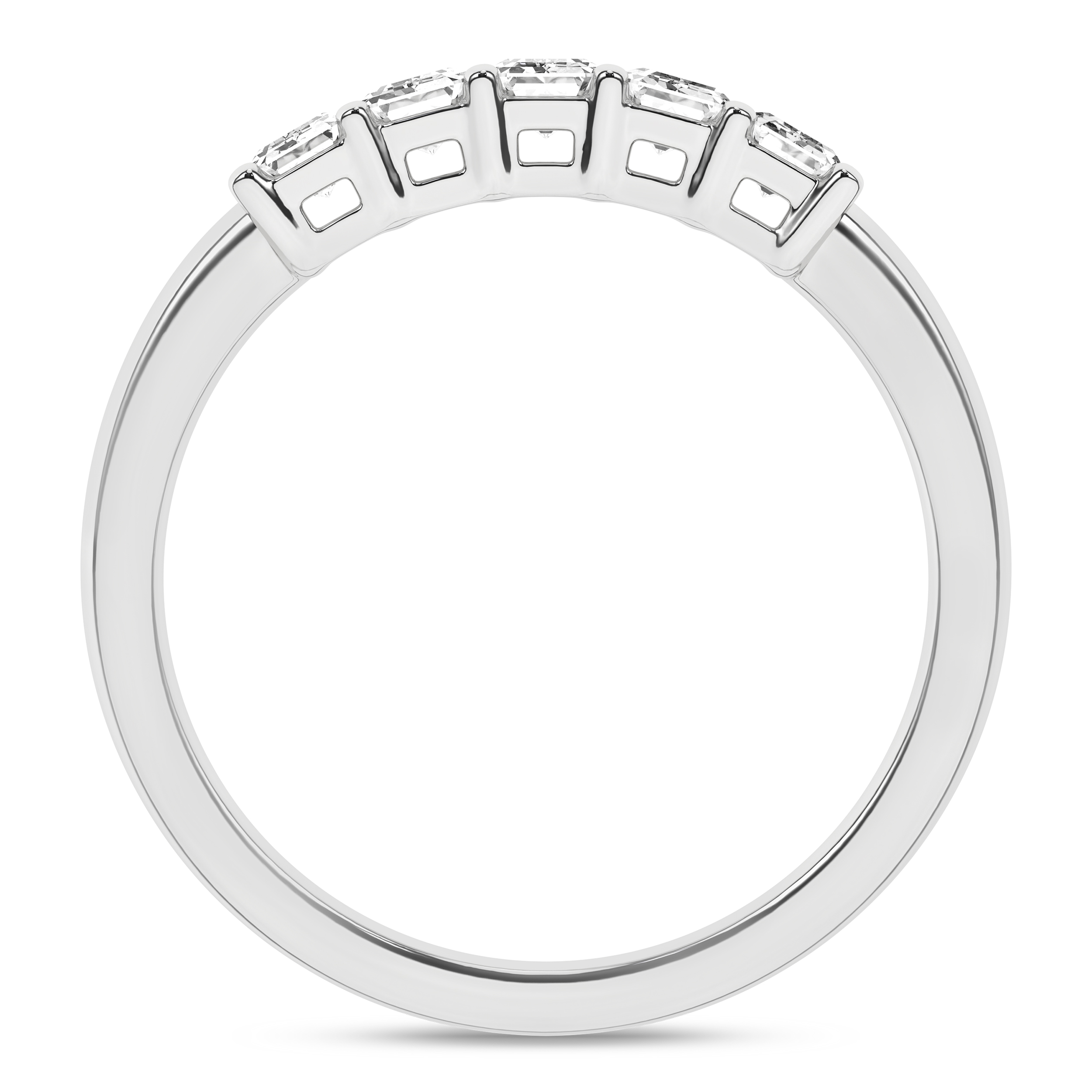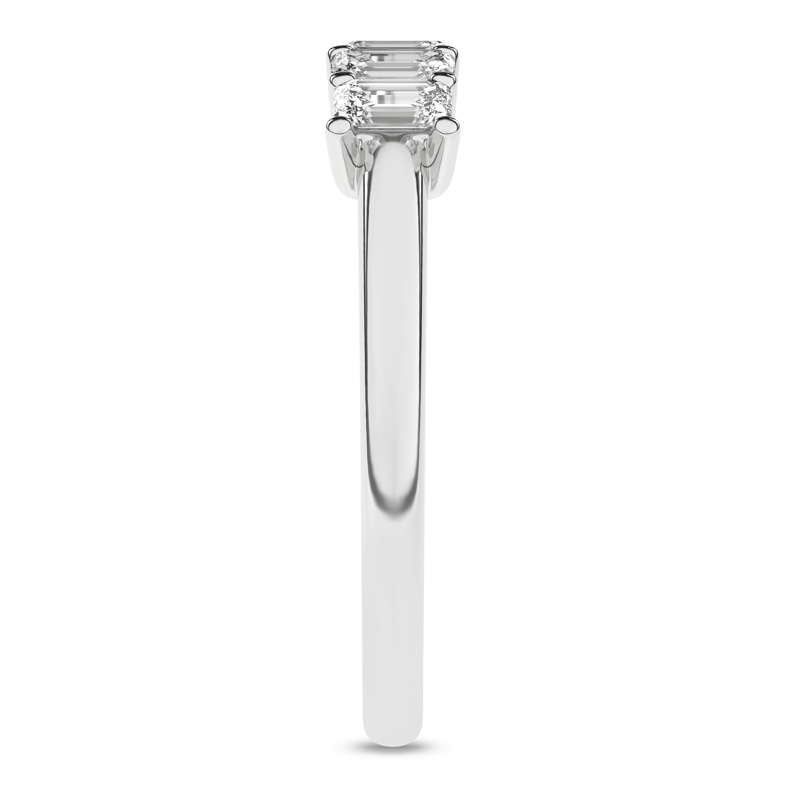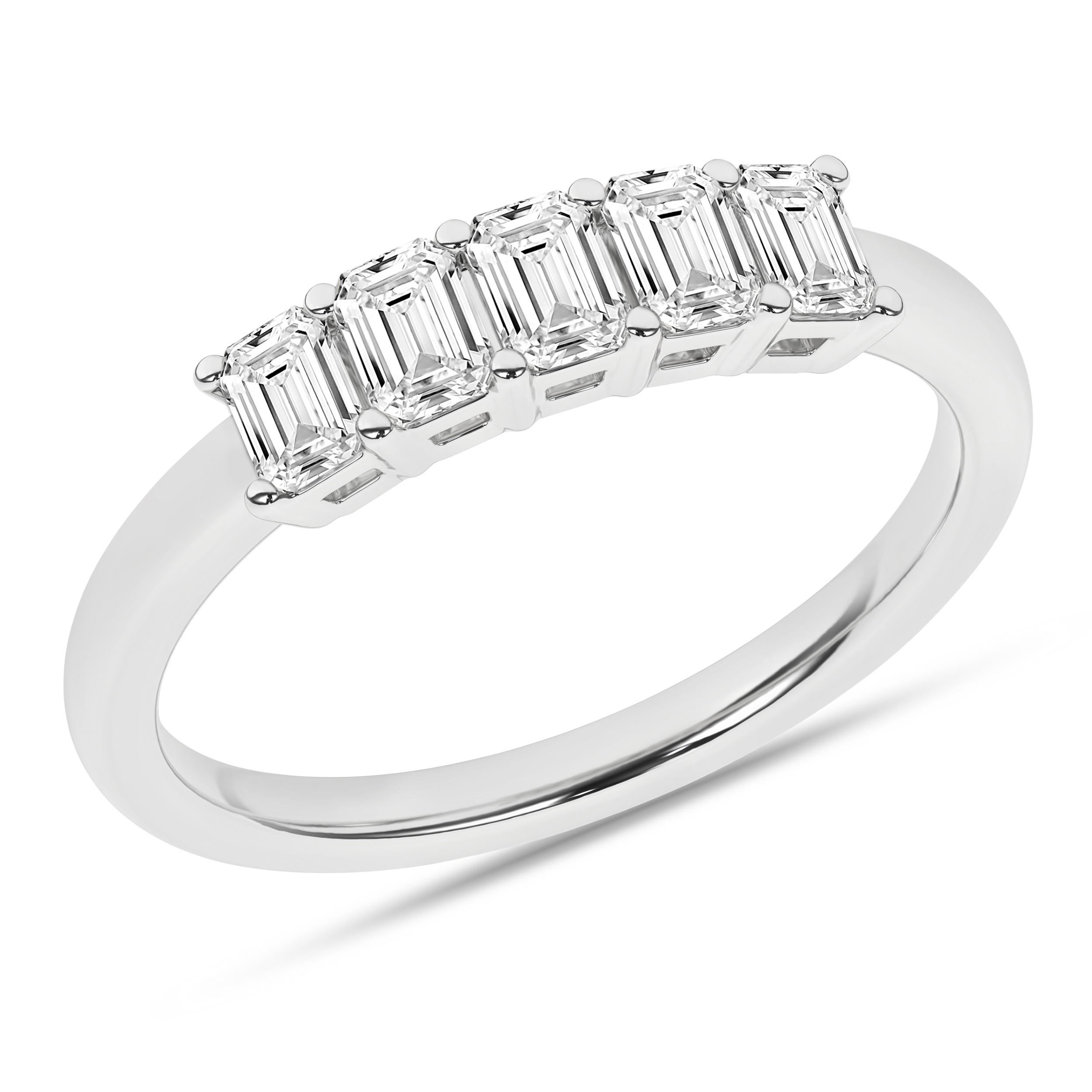 The emerald cut Lab Grown diamond 5-stone band, certified by IGI for quality assurance, is set in 14KT white gold and studded with 1 ctw of diamonds in a timeless four-prong setting. Each emerald-cut Revelation diamond, weighing 1/5 ct., exhibits EF color and VS clarity. This combination of exquisite diamonds and meticulous craftsmanship creates a truly remarkable piece that radiates elegance and sophistication.