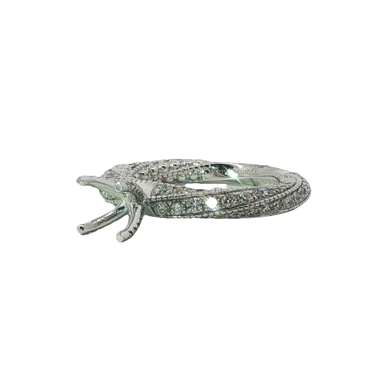 An elegant white gold diamond ring mount featuring a polished finish and a classic band profile. This semi-mount setting is expertly crafted with a smooth interior, displaying a clean hallmarked engraving. Designed for versatility, the minimalist aesthetic showcases excellent symmetry and a high-luster polish. The piece serves as a sophisticated foundation for custom gemstone or diamond integration, embodying a refined and timeless style suitable for fine jewelry enthusiasts seeking bespoke creations. Lady's White 14 Karat Twist Engagement Ring Size 7 With = 0.99Twt Round Diamonds