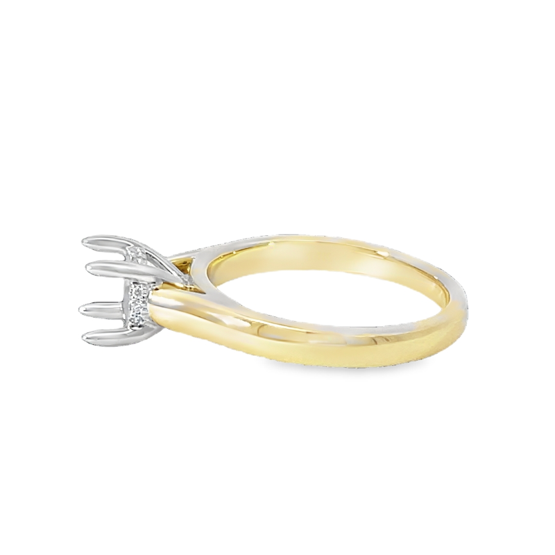 Discover the beauty of this exquisite ring, featuring a stunning blend of gold and silver. The intricate hidden halo cathedral design showcases a unique centerpiece that captures the light beautifully, making it a perfect accessory for any occasion. Whether you're dressing up for a special event or adding a touch of elegance to your everyday look, this ring is sure to impress. Center Stone Sold Separately. 14K Two-Tone, 6.5MM Round, 16 = 0.04Tw Round G/H Si2 Diamonds,Ring Size 6.75