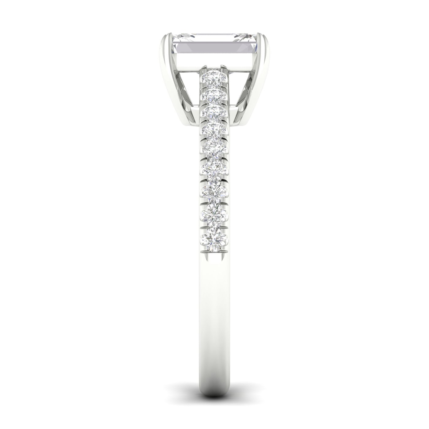 Embrace classic elegance with our Classic Emerald-Cut Lab Grown Diamond Engagement Ring, meticulously crafted in 14KT white gold and adorned with 1 3/4 ctw of diamonds. The true centerpiece of this captivating ring is the emerald-cut 1 1/2 ct revelation diamond gracing the center, held securely in a four-prong eagle-claw setting. Each diamond within this exquisite ring is certified by IGI, ensuring authenticity and impeccable quality, with EF color diamonds and VS clarity. This ring is a symbol of timeless beauty and craftsmanship, a perfect representation of your enduring love and commitment.