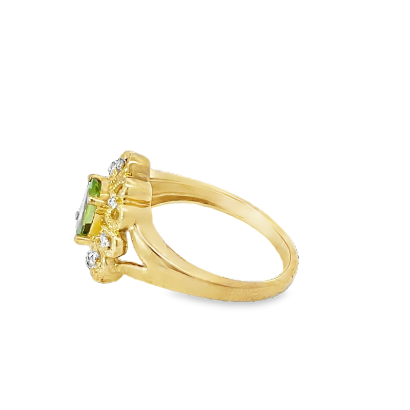 Discover the charm of this elegant vintage floral ring, featuring a stunning peridot at its center. Surrounded by sparkling diamonds, this piece is perfect for adding a touch of sophistication to any outfit. Its intricate design and warm gold tone make it a timeless accessory for both casual and formal occasions. 10K Yellow Gold, One = Oval Peridot And = Round Diamonds, Size 7
