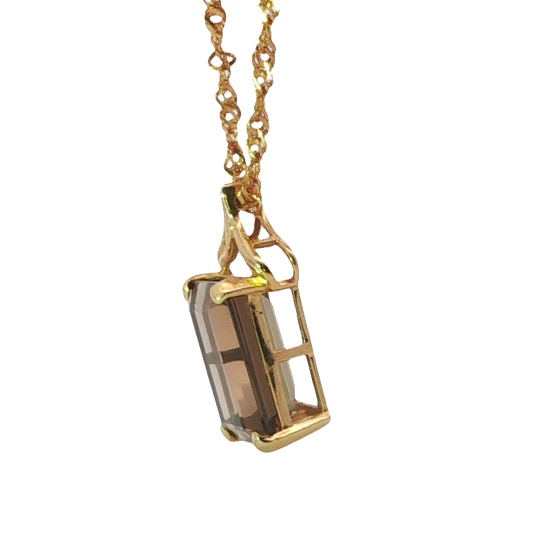 Elevate your style with this charm necklace, featuring an emerald-cut quartz pendant set in radiant yellow gold. The quartz, displaying a captivating yellowish-orange hue, adds a touch of warmth to this elegant piece. Ideal for daily wear or special occasions, this necklace is a timeless addition to any jewelry collection. Yellow 14 Karat Estate Pendant Length 24 With 1 = Rectangular Cushion Smokey Quartz