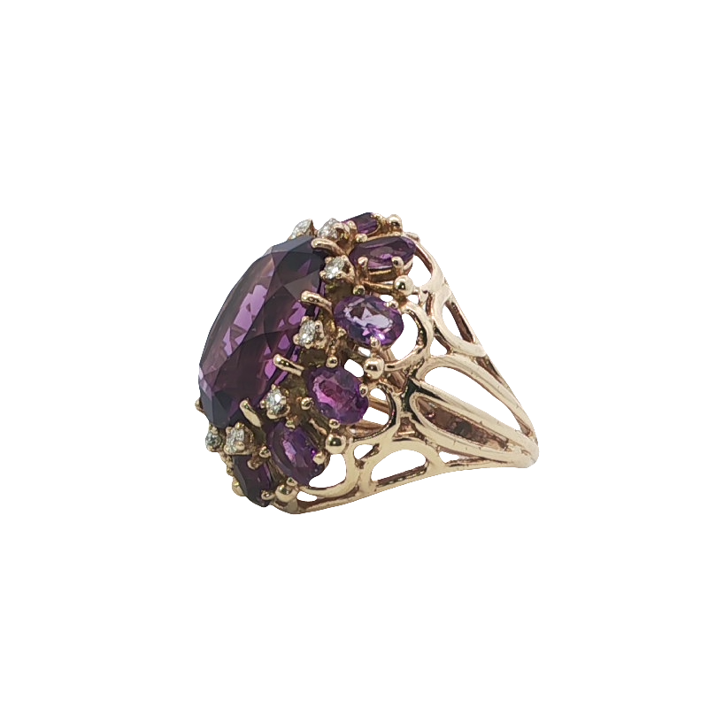 This exquisite yellow gold cocktail ring features a prominent oval-cut purple amethyst central stone. It is framed by a double halo consisting of smaller round-cut amethysts and brilliant diamonds, meticulously prong-set in a decorative floral cluster. The arrangement displays exceptional symmetry and polish, creating a sophisticated and vibrant statement piece. Lady's Yellow 14 Karat Fashion Ring Size 5 With = 16.00X12.50Mm Oval Amethysts, 10 = 5.00X3.00Mm Oval Amethysts And 0.3 Twt Other Stones