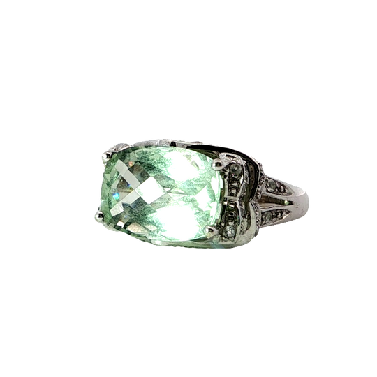 Elevate your style with this stunning white gold cocktail ring. This ring features a mesmerizing cushion-cut green amethyst gemstone with a mixed cutting style, showcasing a serene green hue. Its captivating design is sure to make a statement at any event. Lady's White 14 Karat Vintage Fashion Ring Size 7 With = 14.00X10.00Mm Rectangular Cushion Green Amethyst