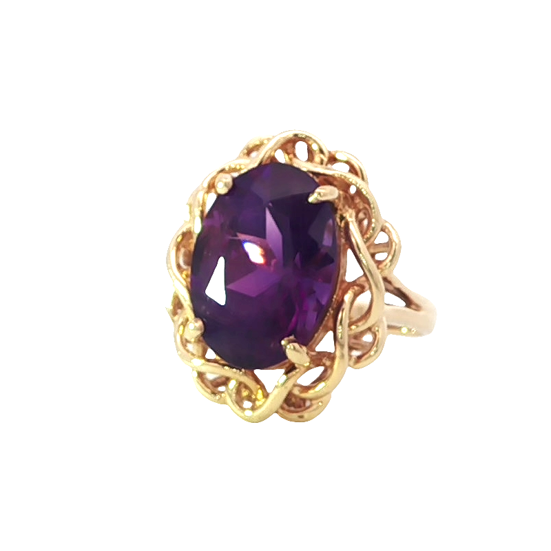 Elevate your ensemble with this exquisite yellow gold cocktail ring. The focal point is an oval cabochon amethyst, radiating a captivating purple hue. This sophisticated piece adds a touch of refined glamour to any occasion. Lady's Yellow 14 Karat Fashion Fashion Ring Size 5.5 With = Oval Amethysts