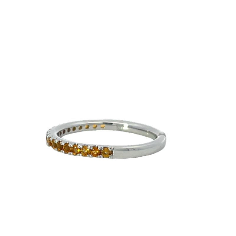 This stunning ring features a delicate band adorned with sparkling citrines, perfect for adding a touch of elegance to any outfit. Crafted with precision, it showcases a beautiful interplay of light and color, making it an ideal choice for special occasions or everyday wear. 14K White Gold, 19 = Round Citrines, 1.45mm, Size 6